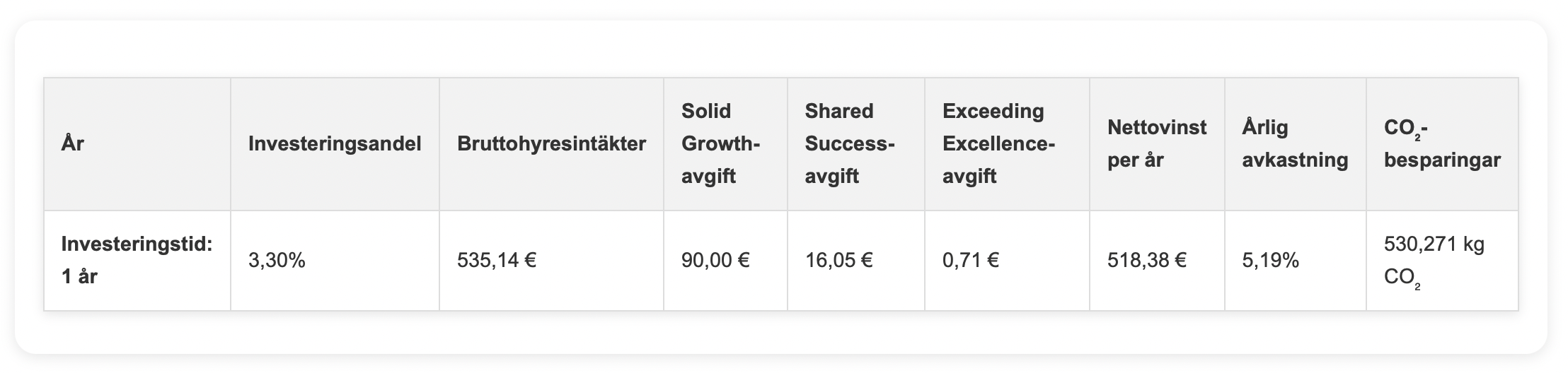 Shared Success Fee tillämpas på månatliga hyresintäkter och används för hållbar utveckling och kontinuerlig reinvestering i dina fastighetsprojekt. Denna avgift gör det möjligt för oss att tillhandahålla nödvändiga resurser för att maximera lönsamheten i dina investeringar.